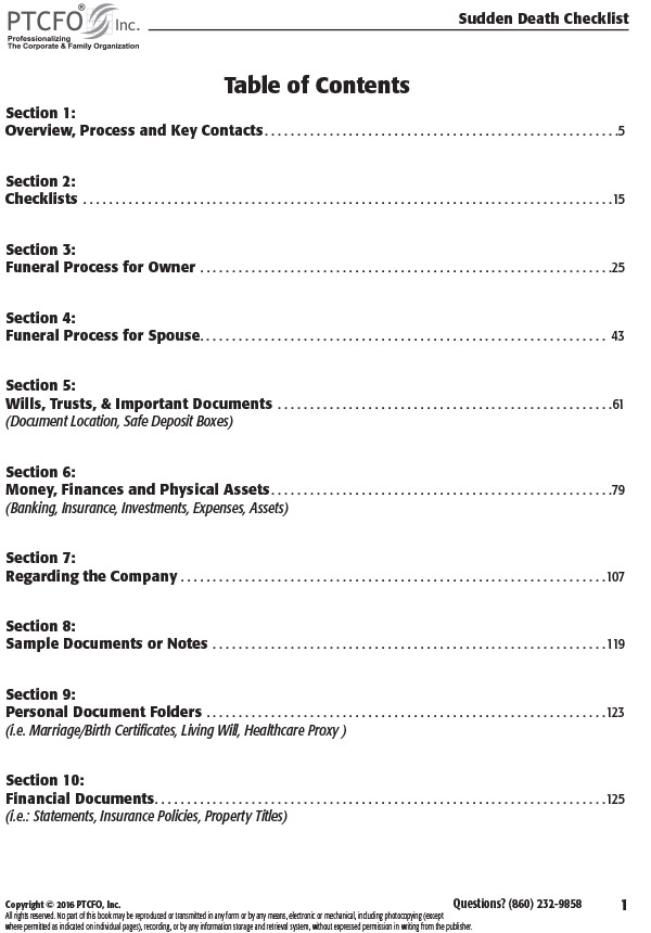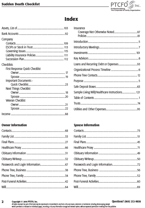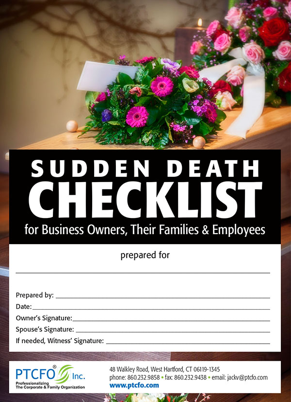 Our Sudden Death Checklist is a comprehensive information storehouse that keeps all of the business owner’s crucial personal and business information in one place, in case of a sudden death or incapacitation. Jack Veale developed this checklist over decades of working with closely held, family owned businesses. Jack’s checklist started out as a 3 page spreadsheet integrated with the company’s long range plan and succession plan; gradually expanding the check list items to cover 100 pages! For example, 15 years ago, having logins and passwords on bank accounts, social media, and other websites was not on the list. IPhones and Android software did not exist. The most important value for this process is to engage the business owner’s spouse, family and key advisors to help the owner create a plan that minimizes the family’s emotional and financial stress typically found during a funeral of a loved one.