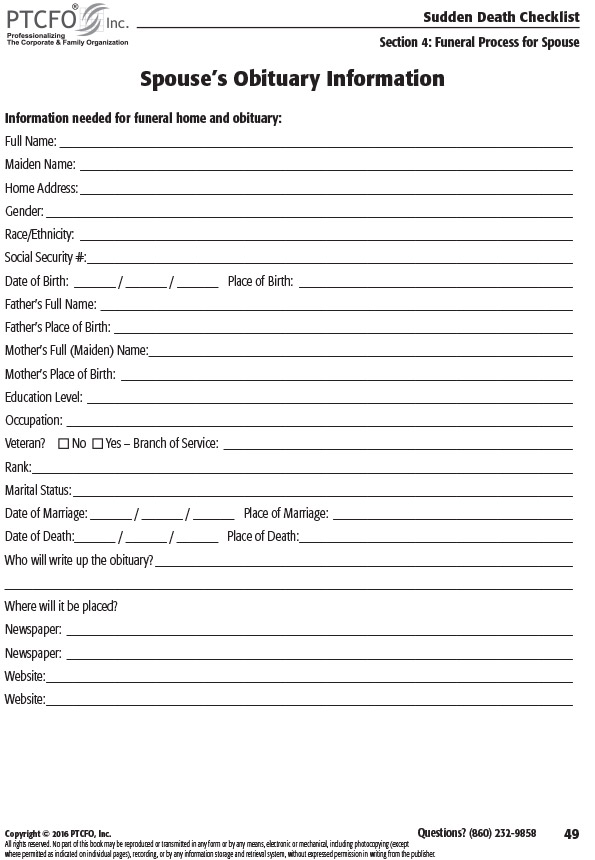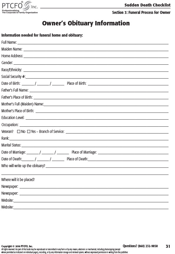 Our Sudden Death Checklist for Business Owners, Their Families & Employees is designed for estate planners and other key advisors to use our checklist to facilitate the discussions in an organized and thoughtful way. From Jack’s view,the owner’s key advisors work in isolation and don’t coordinate well with the business owner’s other advisors.He developed this checklist to engage other advisors as part of his strategy process, and to develop a comprehensive business succession plan. Our checklist helps trusted advisors coordinatewith other advisors, and the owner’s family, to customize the estate planning process. The goal is for business owners to engage their advisors to develop a carefully and thoughtfully prepared funeral and succession plan,to reduce the family’s emotional and financial stress in difficult times. It also designed to minimize the surviving family’s suffering during the funeral’s complex processes, and help their business retain the owner’s business and community legacy. When fully and correctly completed, this book should minimize the family’s emotional struggles with the hundreds of decisions and legal obligations required by the probate court and funeral process; as well as providing stability and peace of mind to the owner’s company and its employees. And more importantly for the business owner, it should ensure that his or her legacy continues without missing a beat; allowing for a smooth transition as he or she has planned.
