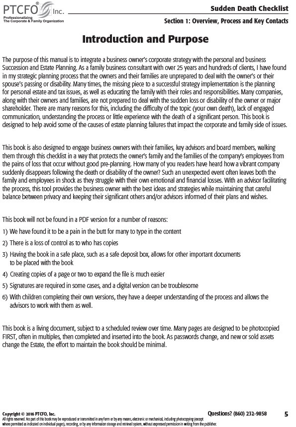 The purpose of this manual is to integrate a business owner’s corporate strategy with the personal and business Succession and Estate Planning.